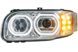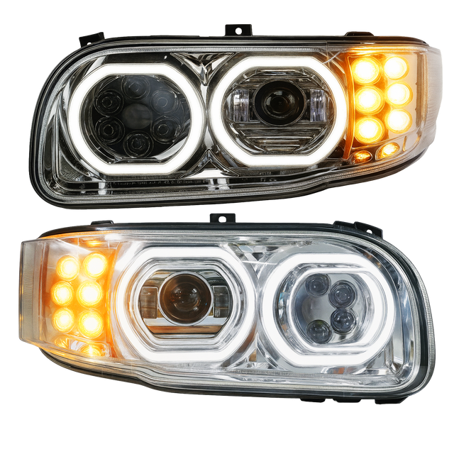 Upgrade your rig with these premium full LED chrome projector headlights, designed specifically for Peterbilt 388, 389, 367, 567, and 589 models. Featuring a brilliant halo ring DRL, high-intensity LED projection beams, and amber sequential turn signals, these headlights deliver powerful illumination and modern style that stands out day or night.