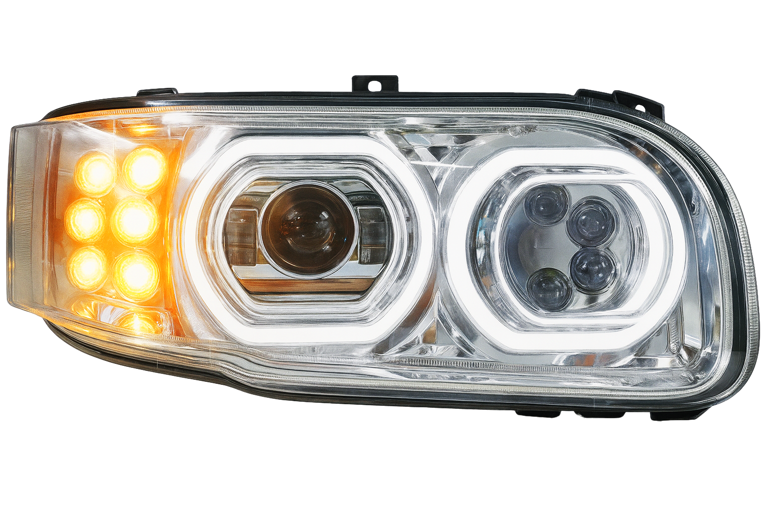 Style meets performance — these projector headlights not only enhance your night driving safety but also give your Peterbilt a custom finish that turns heads wherever you go.