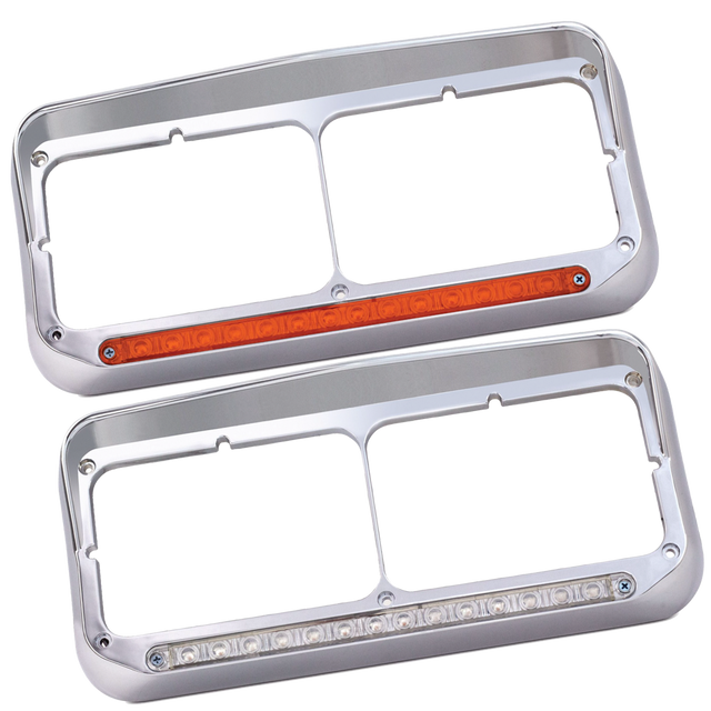 Enhance your truck’s lighting performance and front-end style with this Dual Rectangular Headlight Bezel designed for 4" x 6" semi truck headlights. Featuring a built-in visor and 14 bright amber LED marker lights, this chrome headlight bezel delivers improved road visibility, eye-catching custom styling, and long-lasting durability for commercial trucks, owner-operators, and fleet vehicles.