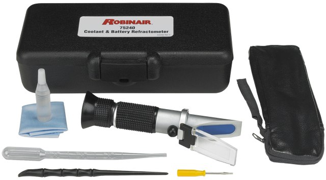 • Robinair's Coolant and Battery Refractometer is designed for use in measuring the freeze point of propylene or ethylene glycol based cooling systems and for checking the strength of electrolyte solution batteries