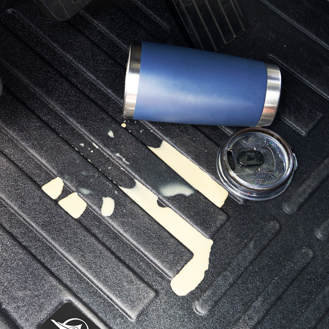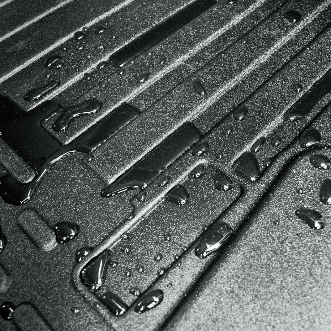 - Ribbed surface and raised edges to trap dirt, mud, and liquids
